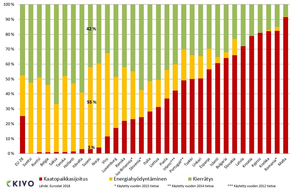 Eurostat julkaisi 23.1.2018 vuoden 2016 eurooppalaiset yhdyskuntajätetilastot. Suomi on saavuttanut eurooppalaiset kärkimaat. EUssa yhdyskuntajätteessä kaatopaikoille päätyy edelleen keskimäärin 25 % ja monessa enemmän kuin puolet kaikesta yhdyskuntajätteestä. Yhdyskuntajätehuollon kärkimaissa hyödynnetään yli 95 % jätteestä. Muutos on Suomessa ollut poikkeuksellisen nopea sillä, vain vielä viisi vuotta aikaisemmin yhdyskuntajätteestä hyödynnettiin vain 60 %.